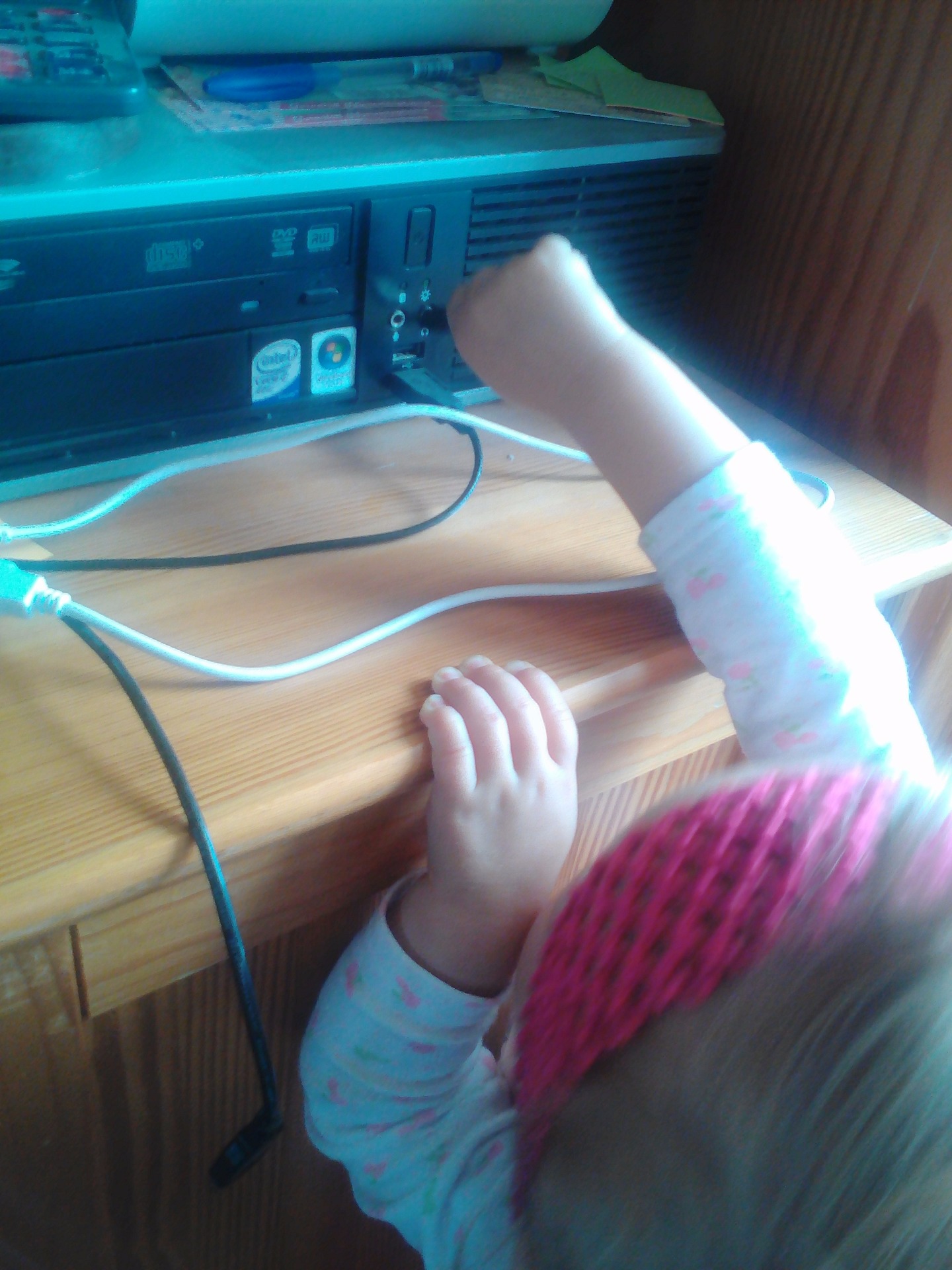 Ma, ahogy töltögetem a képeket mobilról az asztali számítógépre, jön mellém, itt van egy kis használaton kívüli kuka, tele nem használt műszaki kis kütyükkel, ebből egy egeret szokott kivenni és nyomogatja, huzigálja maga után. Azt képzeljétek el, hogy fogta az egere usb kábelét és be akarta dugdosni a gép megfelelő lukába. Köpni-nyelni nem bírtam hirtelen. És kicsit ijesztő is ez a kezdeti "okosság".