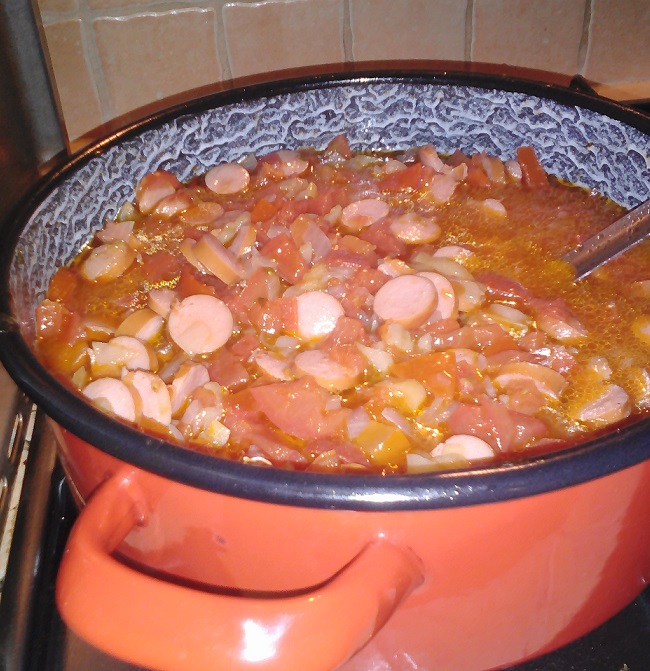 Előkészültem: tehát legalább 3x kivonultam a konyhából sírva (pedig van aprítónk), pucoltam és aprítottam, hagymát, paradicsomot, paprikát. A profik a paradicsomot meghámozzák előtte (beirdalva minden egyes szemet forró vízbe hempergetik 5 mp-ig, majd szépen lehúzható), idő hiányában én most ezzel nem vacakoltam. Szóval minden apró, még a 15 db virslim is felkarikázva. Nálam két serpenyőben zajlott a főzés, mert nincs ekkora lábasom ennyi mindennek. Ízlés szerint olajat melegítettem és a hagymával kezdtem, mikor kezdett üvegesedni, jöhet bele az apró paprika, sóztam, borsoztam és egy csokor petrezselyemzöldet szintén aprón hozzádobtam, majd alacsony lángon fedő alatt párolódni hagytam bő fél órát, míg a paprika is összeesik, néha nem árt megkeverni. Ezután jöhet az apró paradicsom, szintén bő fél óra fedél alatt, míg összerottyan és a végén a numero uno, azaz a virslee. Én ennek is adtam egy kis időt, míg összekovácsolódnak az ízek és tádáááám! Vigyázat fojjó! :)